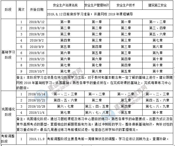 1、整體進度說明:本計劃表從2019年8月12日開始執(zhí)行,計劃于2019年11月15日結(jié)束,共計14周;其中:基礎(chǔ)學(xué)習(xí)階段安排9周,鞏固強化階段安排4周,考前調(diào)整階段安排1周。學(xué)員可根據(jù)本表的提示,結(jié)合自己的工作,學(xué)習(xí)情況進行細化,并按網(wǎng)校要求完成聽課、做題的學(xué)習(xí)任務(wù),基本可滿足考試需要。