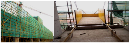 (5)各類垂直運(yùn)輸接料平臺口應(yīng)設(shè)置高度不低于1500mm的樓層防護(hù)門,并應(yīng)設(shè)置防外開裝置;雙籠井架物料提升機(jī)通道中間,應(yīng)分別設(shè)置隔離設(shè)施。