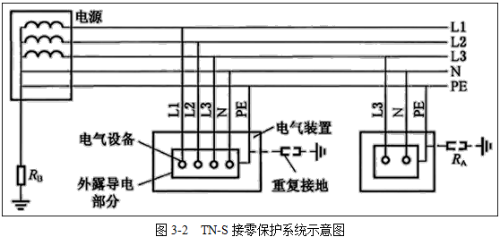 TN-S系統(tǒng)為電源中性點(diǎn)直接接地時,電氣設(shè)備外露可導(dǎo)電部分通過零線接地的接零保護(hù)系統(tǒng)。N為工作零線,PE為專用保護(hù)接地線,即設(shè)備外殼連接到PE上。