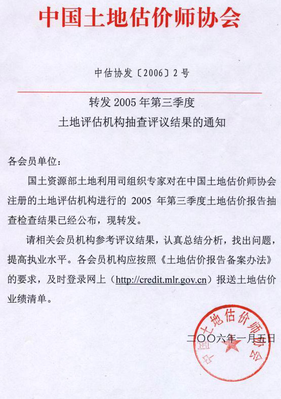 關于2005年第三季度土地評估機構抽查評議結果的公示