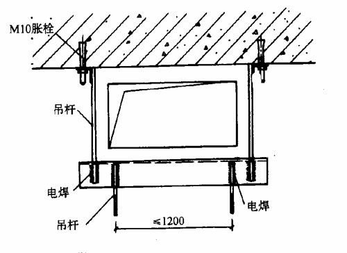 b.吊桿采用6個(gè)的元鋼,根據(jù)彈線中吊桿的位置用可與原有吊桿焊接。并刷兩道防銹漆,當(dāng)頂部的風(fēng)道或障礙物寬度超過(guò)1.2米時(shí),請(qǐng)參照下圖,吊桿設(shè)置間距不得大于1.2米