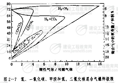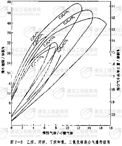 如果爆炸性混合氣體中含有惰性氣體如氮、二氧化碳等,計算爆炸極限時,可先求出混合物中由可燃氣體和惰性氣體分別組成的混合比,再從圖2—7和圖2—8中找出它們的爆炸極限,并分別代入式(2—13)中求得。