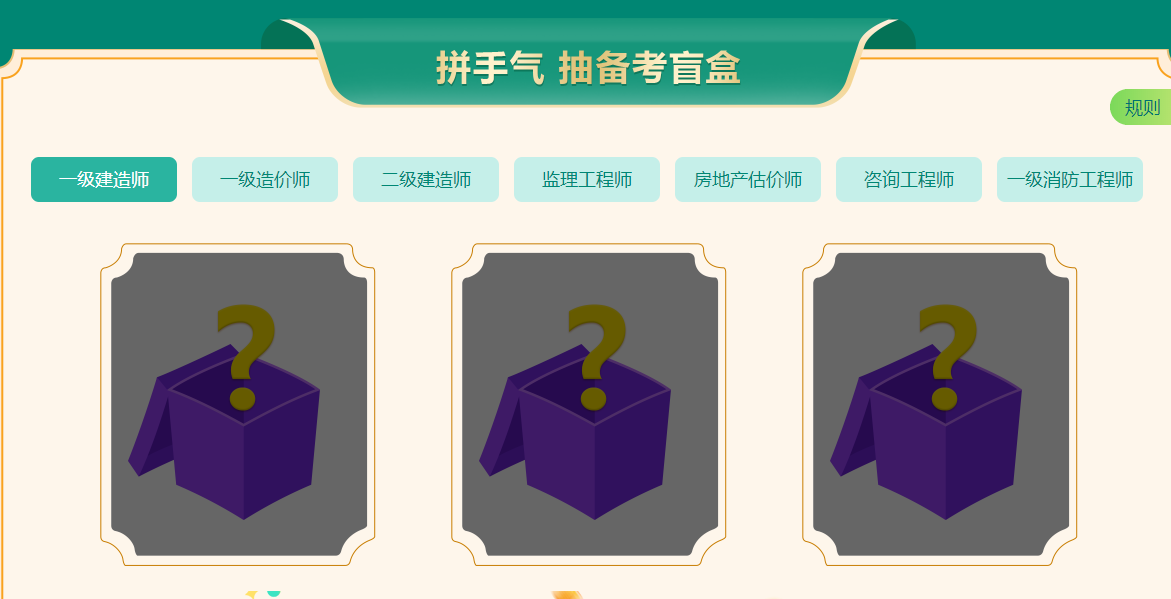2、拼手氣,抽盲盒,里面有試題、課程和資料,去抽盲盒>>