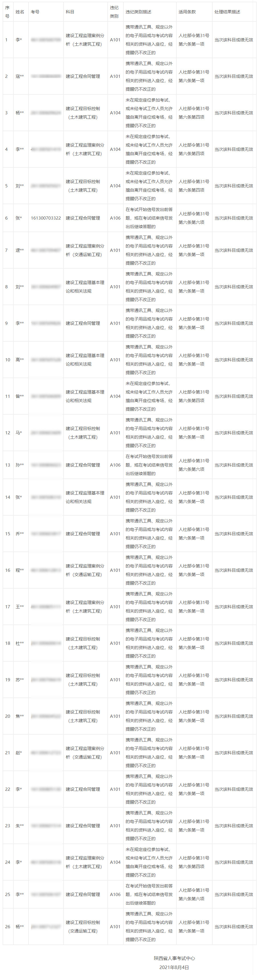 根據(jù)人力資源和社會保障部《專業(yè)技術人員資格考試違紀違規(guī)行為處理規(guī)定》(人社部令第31號),陜西省人事考試中心經(jīng)核實有關應試人員違紀違規(guī)行為事實后研究決定,擬對參加2021年度監(jiān)理工程師職業(yè)資格考試陜西考區(qū)有違紀違規(guī)行為的應試人員作相應處理。此公告涉及的違紀違規(guī)應試人員,自公告發(fā)布之日起5個工作日內(nèi),可根據(jù)有關規(guī)定向省人事考試中心書面提交復核申請,逾期不再受理?,F(xiàn)將有關情況公告如下: