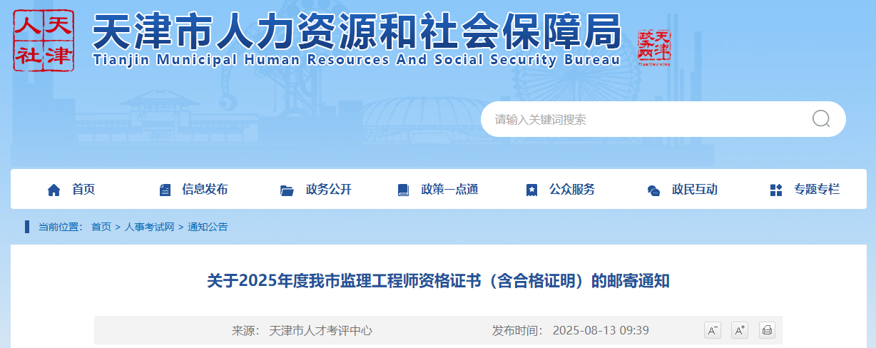 2025年度天津監(jiān)理工程師資格證書(含合格證明)的郵寄最新通知,目前證書郵寄網(wǎng)上預(yù)定工作已結(jié)束,預(yù)計本周寄出,官方通知如下: