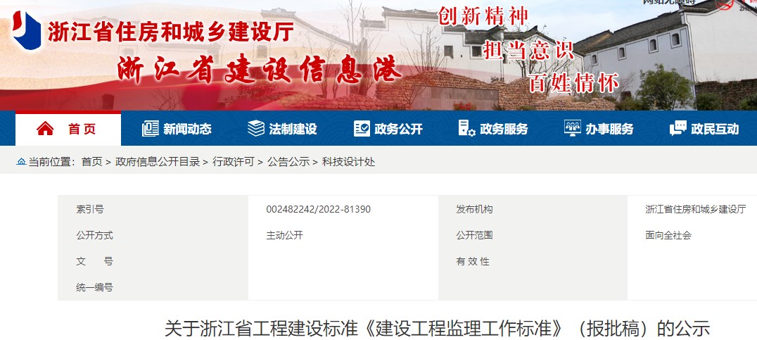 根據(jù)我廳《關(guān)于印發(fā)<2021年度浙江省建筑節(jié)能與綠色建筑及相關(guān)工程建設(shè)標(biāo)準(zhǔn)制修訂計(jì)劃>(第一批)的通知》(浙建設(shè)函〔2021〕145號(hào)),由浙江省全過程工程咨詢與監(jiān)理管理協(xié)會(huì)等單位編制的《建設(shè)工程監(jiān)理工作標(biāo)準(zhǔn)》已完成報(bào)批稿的編制工作?,F(xiàn)將《建設(shè)工程監(jiān)理工作標(biāo)準(zhǔn)》(報(bào)批稿)予以公示,公示時(shí)間為2022年8月20日-2022年9月4日。