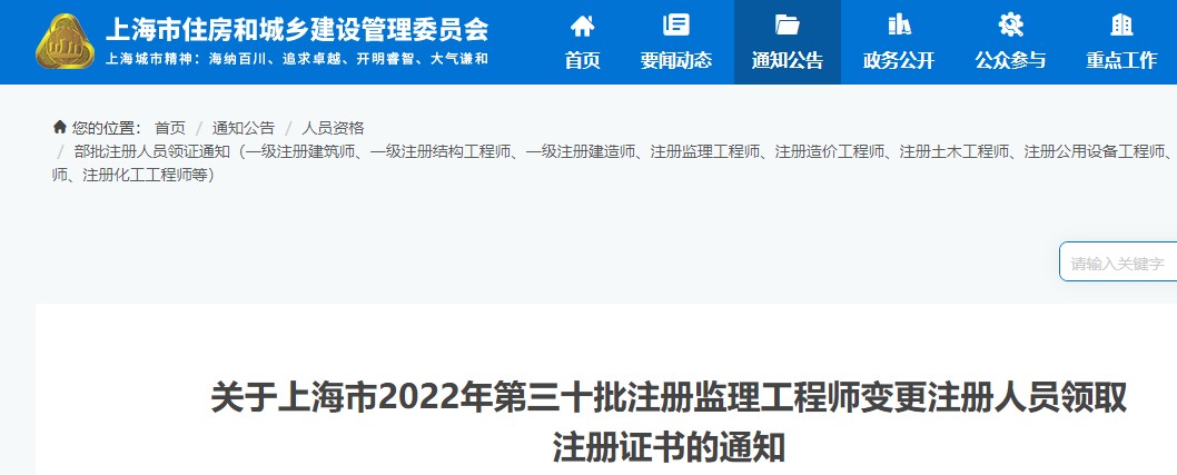 關(guān)于上海市2022年第三十批注冊監(jiān)理工程師變更注冊人員領(lǐng)取注冊證書的通知