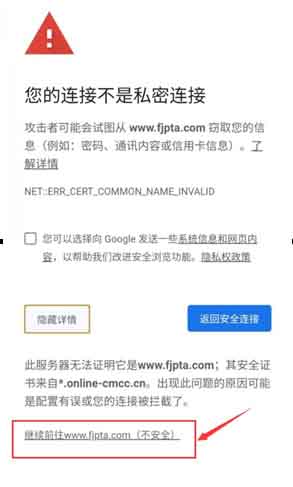近期有考生反映:在使用本網(wǎng)站主觀題成績(jī)核查、證書(shū)郵寄等功能時(shí),無(wú)法正常訪問(wèn),IE瀏覽器提示403錯(cuò)誤,谷歌瀏覽器提示“您的連接不是私密連接”等情況。經(jīng)排查,發(fā)現(xiàn)是考生使用中國(guó)移動(dòng)的網(wǎng)絡(luò)(包括4G/5G)無(wú)法訪問(wèn)。為保護(hù)廣大考生的信息安全,若在訪問(wèn)本網(wǎng)站過(guò)程中發(fā)現(xiàn)類似下圖錯(cuò)誤提示時(shí),請(qǐng)立即暫停訪問(wèn),建議使用中國(guó)電信或中國(guó)聯(lián)通網(wǎng)絡(luò)訪問(wèn)本網(wǎng)站。