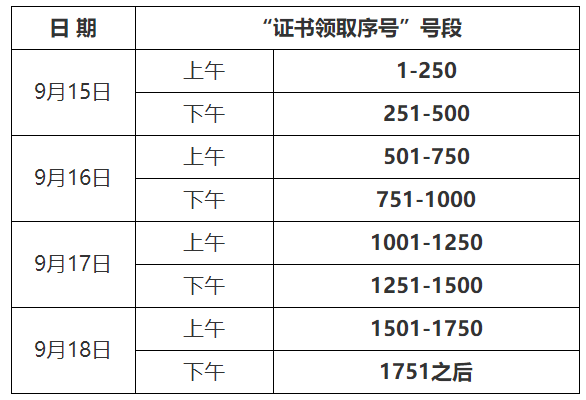 現(xiàn)場辦理的考生請先關(guān)注微信公眾號“阜陽人社”,點擊功能區(qū)“人社服務(wù)---證書查詢”,輸入證件號碼獲取“證書領(lǐng)取序號”,按照下表的工作安排前往辦理。