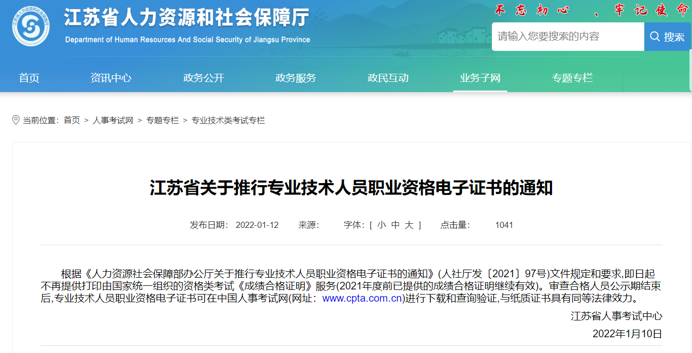 江蘇省關(guān)于推行專業(yè)技術(shù)人員職業(yè)資格電子證書的通知