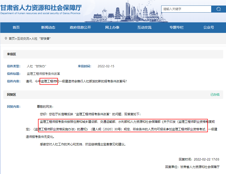 2022年監(jiān)理工程師報考條件是否發(fā)生變化?來看甘肅人社廳的回復!