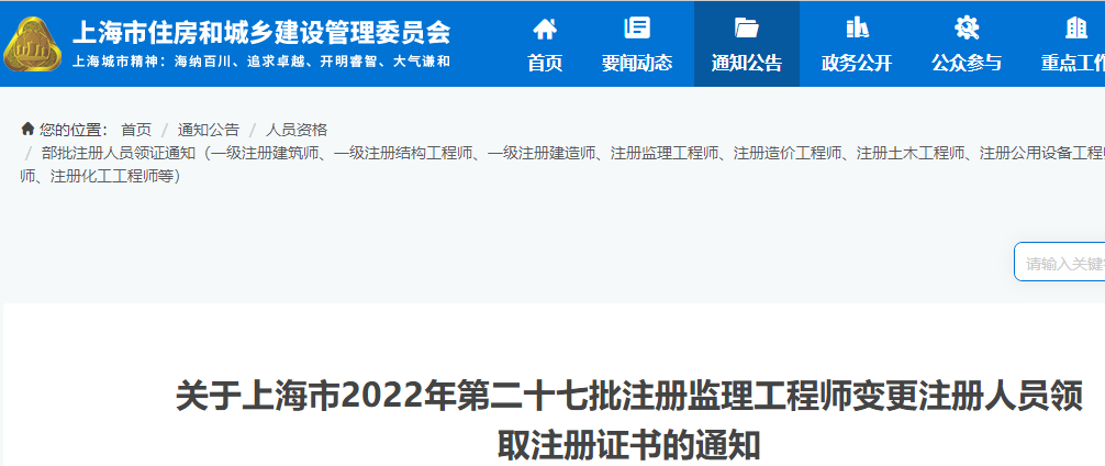 上海2022年第二十七批注冊(cè)監(jiān)理工程師變更注冊(cè)人員領(lǐng)取注冊(cè)證書(shū)的通知