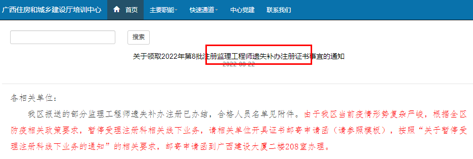 廣西領(lǐng)取2022年第8批注冊監(jiān)理工程師遺失補(bǔ)辦注冊證書事宜的通知