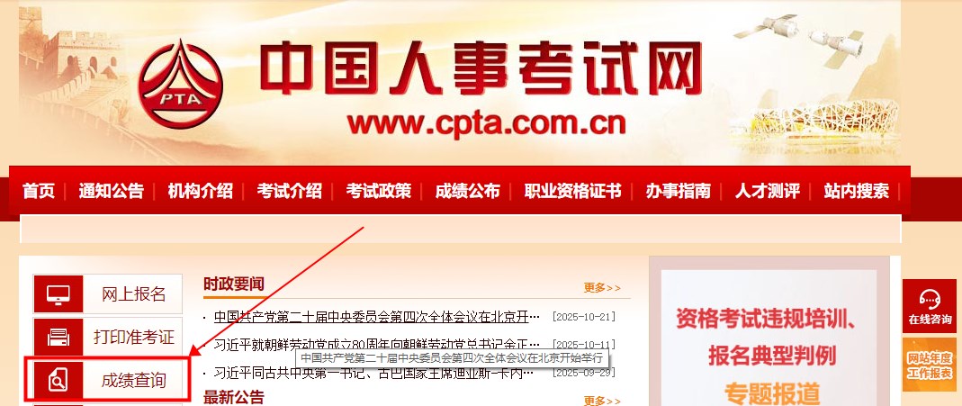 2025年一級(jí)建造師成績(jī)查詢?nèi)肟冢?/strong>中國(guó)人事考試網(wǎng)-點(diǎn)擊左側(cè)“成績(jī)查詢”按鈕,輸入用戶名、密碼、驗(yàn)證碼登錄即可查詢一級(jí)建造師考試成績(jī)。