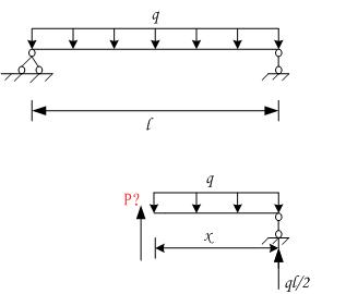 其他部位的彎矩利用截面法來計算,以第二個圖為例,比如求剪力P所在位置的彎矩,截開的截面到右側(cè)端點的距離為x,其彎矩=1/2qlx-1/2qx2