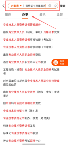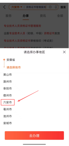 2.輸入“專業(yè)技術(shù)人員資格證書管理服務(wù)”,選擇“辦事”模塊,點(diǎn)擊下方“專業(yè)技術(shù)人員資格證書管理服務(wù)”,選擇辦事地區(qū)“六安市”,點(diǎn)擊“去辦理”。
