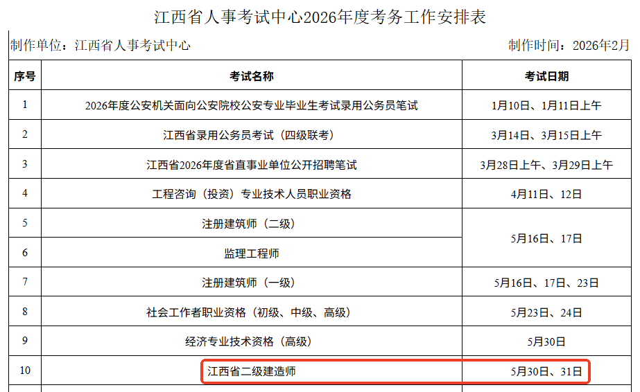 江西省2026年二級建造師考試時(shí)間:5月30日、31日