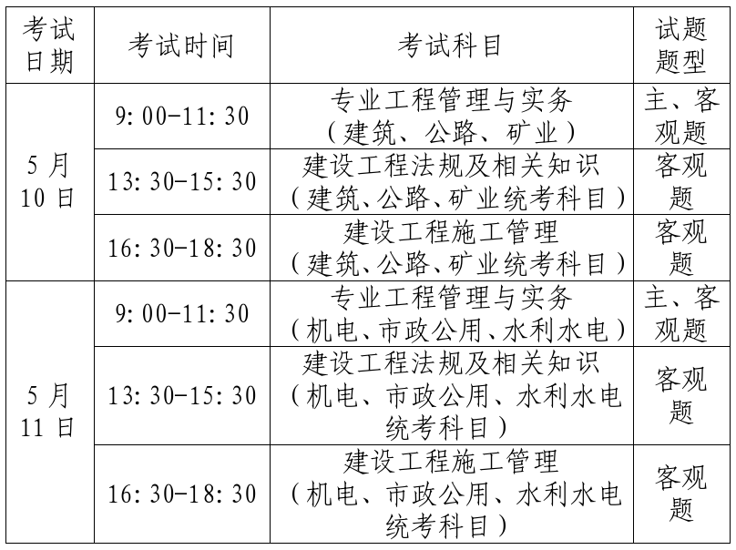 考試按《專業(yè)工程管理與實(shí)務(wù)》科目專業(yè)類別分2天2批次實(shí)施,具體考試時(shí)間、科目和題型見表格。