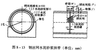 通常采用帶有混凝土條形基礎(chǔ)的鋼絲網(wǎng)水泥砂漿抹帶的剛性接口;在地質(zhì)條件較差時(shí)也應(yīng)設(shè)置柔性接口。