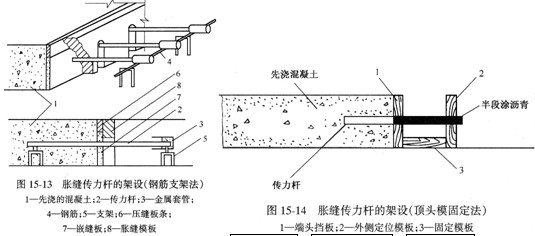傳力桿的固定安裝方法有兩種。一種是端頭木模固定傳力桿安裝方法,宜用于混凝土板不連續(xù)澆筑時設(shè)置的脹縫。另一種是支架固定傳力桿安裝方法,宜用于混凝土板連續(xù)澆筑時設(shè)置的脹縫。兩種方法見圖示。