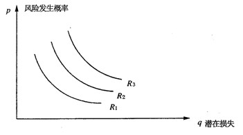 與風(fēng)險(xiǎn)量有關(guān)的另一個(gè)概念是等風(fēng)險(xiǎn)量曲線,就是由風(fēng)險(xiǎn)量相同的風(fēng)險(xiǎn)事件所形成的曲線,如圖4-5所示。在圖4-5中,R1、R2、R3,為3條不同的等風(fēng)險(xiǎn)量曲線。不同等風(fēng)險(xiǎn)量曲線所表示的風(fēng)險(xiǎn)量大小與其與風(fēng)險(xiǎn)坐標(biāo)原點(diǎn)的距離成正比,即距原點(diǎn)越近,風(fēng)險(xiǎn)量??;反之,則風(fēng)險(xiǎn)量越大。因此,R1<R2<R3.