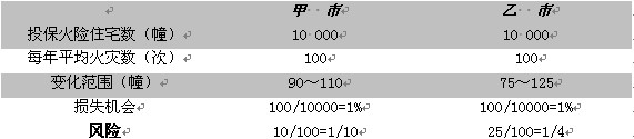 由表4一1可知,雖然甲、乙兩市火災的損失機會相同,但乙市火災的風險大于甲市,因為乙市火災的不確定性高于甲市。