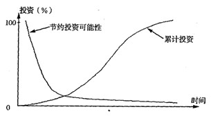 需要特別指出的是,在建設(shè)工程實(shí)施過程中,累計(jì)投資在設(shè)計(jì)階段和招標(biāo)階段緩慢增加,進(jìn)人施工階段后則迅速增加,到施工后期,累計(jì)投資的增加又趨于平緩。另一方面,節(jié)約投資的可能性(或影響投資的程度)從設(shè)計(jì)階段到施工開始前迅速降低,其后的變化就相當(dāng)平緩了。累計(jì)投資和節(jié)約投資可能性的上述特征可用圖3-7表示。