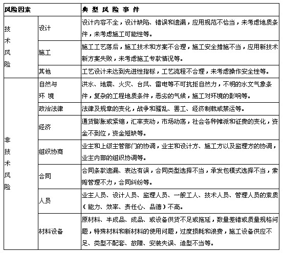 通過適當(dāng)?shù)娘L(fēng)險(xiǎn)分解方式來識(shí)別風(fēng)險(xiǎn)是建立建設(shè)工程初始風(fēng)險(xiǎn)清單的有效途徑。對(duì)于大型、復(fù)雜的建設(shè)工程,首先將其按單項(xiàng)工程、單位工程分解,再對(duì)各單項(xiàng)工程、單位工程分別從時(shí)間維、目標(biāo)維和因素維進(jìn)行分解,可以較容易地識(shí)別出建設(shè)工程主要的、常見的風(fēng)險(xiǎn)。從初始風(fēng)險(xiǎn)清單的作用來看,因素維僅分解到各種不同的風(fēng)險(xiǎn)因素是不夠的,還應(yīng)進(jìn)一步將各風(fēng)險(xiǎn)因素分解到風(fēng)險(xiǎn)事件。表4一2為建設(shè)工程初始風(fēng)險(xiǎn)清單示例。