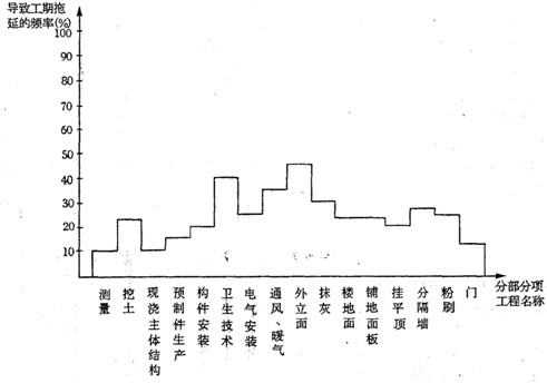 例如,根據(jù)建設(shè)工程的經(jīng)驗(yàn)數(shù)據(jù)或統(tǒng)計(jì)資料可以得知,減少投資風(fēng)險(xiǎn)的關(guān)鍵在設(shè)計(jì)階段,尤其是初步設(shè)計(jì)以前的階段,因此,方案設(shè)計(jì)和初步設(shè)計(jì)階段的投資風(fēng)險(xiǎn)應(yīng)當(dāng)作為重點(diǎn)進(jìn)行詳細(xì)的風(fēng)險(xiǎn)分析;設(shè)計(jì)階段和施工階段的質(zhì)量風(fēng)險(xiǎn)最大,需要對(duì)這兩個(gè)階段的質(zhì)量風(fēng)險(xiǎn)作進(jìn)一步的分析;施工階段存在較大的進(jìn)度風(fēng)險(xiǎn),需要作重點(diǎn)分析。由于施土活動(dòng)是由一個(gè)個(gè)分部分項(xiàng)工程按一定的邏輯關(guān)系組織實(shí)施的,因此,進(jìn)一步分析各分部分項(xiàng)工程對(duì)施工進(jìn)度或工期的影響,更有利于風(fēng)險(xiǎn)管理人員識(shí)別建設(shè)工程進(jìn)度風(fēng)險(xiǎn)。圖4一4是某風(fēng)險(xiǎn)管理主體根據(jù)房屋建筑工程各主要分部分項(xiàng)工程對(duì)工期影響的統(tǒng)計(jì)資料繪制的。