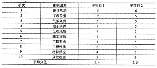 3)確定工程復(fù)雜程度。按構(gòu)成工程復(fù)雜程度的10個因素考慮,根據(jù)本工程實際情況分別按10分制打分。具體結(jié)果見表5-5.