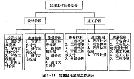 如果建設(shè)工程進(jìn)行實(shí)施階段全過(guò)程監(jiān)理,監(jiān)理工作劃分可按設(shè)計(jì)階段和施工階段分別歸并和組合,如圖5-11所示。