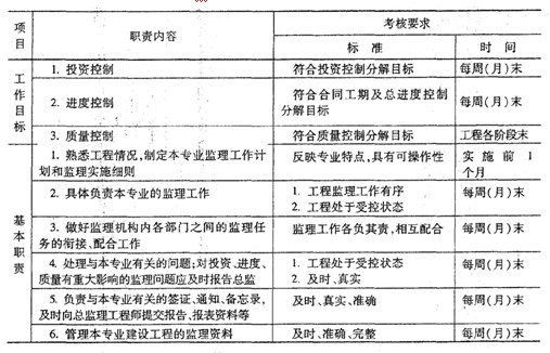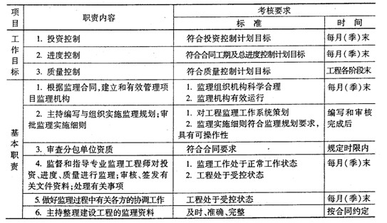 崗位職務(wù)及職責(zé)的確定,要有明確的目的性,不可因人設(shè)事。根據(jù)責(zé)權(quán)一致的原則,應(yīng)進(jìn)行適當(dāng)?shù)氖跈?quán),以承擔(dān)相應(yīng)的職責(zé);并應(yīng)確定考核標(biāo)準(zhǔn),對(duì)監(jiān)理人員的工作進(jìn)行定期考核,包括考核內(nèi)容、考核標(biāo)準(zhǔn)及考核時(shí)間。表5-1和表5-2分別為項(xiàng)目總監(jiān)理工程師和專(zhuān)業(yè)監(jiān)理工程師崗位職責(zé)考核標(biāo)準(zhǔn)。