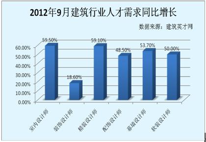 據(jù)建筑英才網(wǎng)最新數(shù)據(jù)顯示,截至2012年9月初,建筑人才總體需求較去年同期增長14.8%,增長勢頭穩(wěn)中有升。其中,漲幅最為顯著的,為室內(nèi)設(shè)計(jì)師和精裝設(shè)計(jì)師,其需求較去年同期增長分別為59.5%和59.1%,系熱門職位之首;而幕墻設(shè)計(jì)師和軟裝設(shè)計(jì)師需求較去年同期增長分別為53.7%和50%,增幅達(dá)五成以上,其炙手可熱程度不可小覷。同時(shí),配飾設(shè)計(jì)師也備受追捧,其需求較去年同期增長達(dá)48.5%.另外,裝飾設(shè)計(jì)師需求較去年同期增長18.6%,依然如故成為眾家名企獵聘的對象。金九銀十期間裝飾裝修人才供需如火如荼,人才需求將持續(xù)高漲。