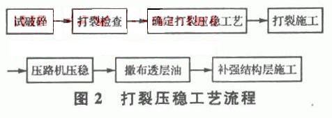 3.4確定壓穩(wěn)程序在確定打裂程序滿足要求后,確定壓穩(wěn)程序,一般壓穩(wěn)遍數(shù)為3-5遍?刂茦藴蕿椋涸诎创_定程序施工的試驗路段,每25米取一點,并且總數(shù)不小于5個點。打裂完成后對這五個點進行水準測量,并在每壓穩(wěn)1遍時測量每個點的沉降量變化,如果這五個點的每次壓穩(wěn)后最大沉降變化量小于5mm,則認為壓穩(wěn)施工達到要求。壓穩(wěn)次數(shù)不得小于2遍。壓實速度不應(yīng)超過4.8km/h。具體工藝流程見下圖: