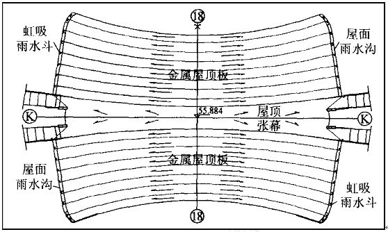 東、西兩側(cè)的連接樓及指廊屋面排水設(shè)計(jì)方面連接樓屋面2/3面積采用虹吸排水。另1/3面積由于屋面造型關(guān)系,集水溝設(shè)在2層,因集水溝標(biāo)高小