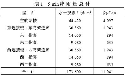 航站樓屋面由主航站樓、東西連接樓、東西指廊及東西高架連廊屋面組成,見圖1.屋面采用大跨度的鋼結(jié)構(gòu)及張拉幕,水平投影總面積達(dá)17136萬㎡,5min雨水總量達(dá)11041L/s(暴雨重現(xiàn)期P=20a,降雨強(qiáng)度為229mm/h),具體見表1。