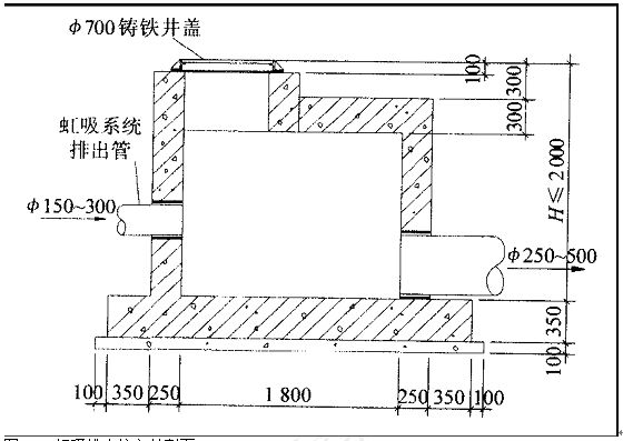 針對(duì)航站樓虹吸排水系統(tǒng)的特點(diǎn),專門設(shè)計(jì)了虹吸雨水井。雨水井平面凈空尺寸1800mm×1500mm,高度視管道埋深而定,采用鋼筋混凝土一次澆鑄而成,鑄鐵井蓋設(shè)有占總面積30%的泄壓孔,剖面見圖4。
