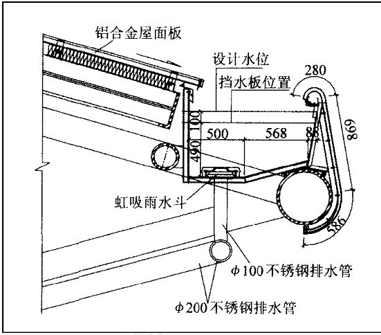 在雨水溝的設(shè)計(jì)方面,由于主航站樓屋面呈弧型設(shè)計(jì),中間最高處與東西兩側(cè)的雨水溝高差達(dá)25m,巨大的高差使雨水匯集到雨水溝時(shí)產(chǎn)生較大的沖擊力,為避免雨水沖出溝外,雨水溝的設(shè)計(jì)寬度達(dá)1m,深度達(dá)0.8m。由于每條雨水溝沿弧形屋面設(shè)置,不同位置的標(biāo)高相差較大,為避免雨水過分集中到標(biāo)高較低的雨水斗處,在雨水溝內(nèi)根據(jù)每個(gè)集水區(qū)分段設(shè)置擋水板,使屋面雨水均勻排放。擋水板比雨水溝的設(shè)計(jì)水位低100mm,萬一某個(gè)雨水斗意外堵塞,雨水可溢流到相鄰的雨水斗排放,雨水溝剖面見圖3。另外,在每個(gè)雨水斗的位置,各專門設(shè)計(jì)了一個(gè)有效容積1~118m3的不銹鋼集水井,以保證系統(tǒng)能迅速形成虹吸。管道設(shè)計(jì)方面,基本上采用單斗或雙斗排水系統(tǒng),懸吊管水平或沿桁架構(gòu)件安裝。系統(tǒng)設(shè)計(jì)負(fù)壓不低于-90kPa,大部分排出管的流速控制在4m/s以內(nèi)。管材的選用:隱蔽部分采用卡箍式離心鑄鐵管;外露部分配合立面設(shè)計(jì)要求,采用不銹鋼管,使不銹鋼管與結(jié)構(gòu)桁架完美地結(jié)合在一起,仿佛鋼結(jié)構(gòu)構(gòu)件的一部分。雨水井設(shè)計(jì)方面,由于系統(tǒng)排出管雨水流速極高,流量極大(最高流速超過6m/s,流量達(dá)100L/s以上),要求雨水井壁能承受雨水的高速?zèng)_刷,同時(shí)能迅速地把大量的雨水排到室外管網(wǎng),一般的雨水井顯然不能滿足要求。