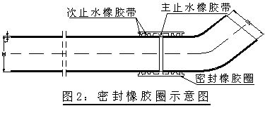 ②將不銹鋼卡箍先套在接口一端的管身上。③在管接口外壁涂一些肥皂水作為潤滑劑,將橡膠圈的一端套在管接口上(一般是套在已固定好的管子或管件這一端),并應(yīng)套入至安裝(主止水橡膠帶處)規(guī)定深度。見圖2