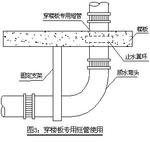 A、管道支架安裝:排水管每3m設(shè)一個(gè)固定支架,在兩個(gè)固定支架之間應(yīng)設(shè)一個(gè)滑動(dòng)支架。若兩個(gè)固定支架間距小于1.5米時(shí)可不設(shè)滑動(dòng)支架。兩個(gè)接口之間至少應(yīng)有一個(gè)支架。當(dāng)立管在樓層上安裝時(shí),立管穿樓板應(yīng)采用“穿樓板專用短管”。該短管的止水翼環(huán)應(yīng)放在樓板二分之一厚度處,用膨脹水泥砂漿填筑樓板孔洞,即可防止?jié)B漏又使該處成為固定支撐點(diǎn),即可當(dāng)作一個(gè)固定支架。