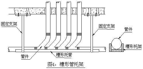 C、在管配件比較密齊,幾乎是管件相互連接時(shí),應(yīng)在管件下設(shè)置槽形管托,支(吊)架與管托相連接,固定支架和吊架相互間隔,每3米一個(gè)。見附圖:4