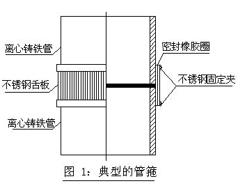 柔性卡箍式離心鑄鐵排水管是由:無承口離心鑄鐵管、無承口管道配件、專用不銹鋼卡箍及橡膠密封圈等四大部分組成,接口是將直管或配件的端頭插入專用的橡膠密封圈內(nèi),橡膠密封圈外用專用的不銹鋼卡箍鎖緊,達(dá)到連接和止水的目的。如圖1