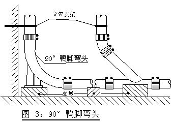 B、立管底部應(yīng)用支墩或用加強(qiáng)型支架。由于卡箍連接不能承受軸向拉力,依安裝實(shí)際情況,若立管底部轉(zhuǎn)彎處著地可采用900的鴨腳彎頭配件固定于地板上。如圖:3