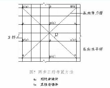 4.6連墻點宜優(yōu)先采用菱形布置,也可采用方形、矩形布置,宜按豎向架面盡量均勻分布(在結構層高和建筑外圍有變化時不易達到),這樣在步高與縱距相同的情況下,就可以避免架體發(fā)生局部失穩(wěn)破壞,從而只需對整體穩(wěn)定性進行控制。如圖5、圖2a、b、c