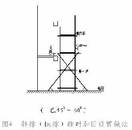 4.4連墻件應從底層第一步大橫桿處開始設置,實際搭設中因為第一層的建筑層高多大于腳手架最大控制步高(2m),而于結構一層梁處開始設置,或者由于第一層梁板處尚未進行預埋件設置和澆筑混凝土,導致在搭設第一步腳手架并設置連墻件有實際困難,此時應采用斜撐來代替水平連墻件作為臨時加固設置,其設置同7m以下架體采用拋撐的形式一樣;拋撐應采取通長桿件與腳手架可靠連接,與地面的傾角α應在45.~60.之間,在連墻件設置后方可拆除。具體設置如圖4。