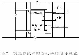 5.5建筑物的現(xiàn)澆欄板式陽臺處的連墻件設置,可以有二種處理方式:1)采用剛性連墻件,用φ6.5cm的PVC管作為連墻件的套筒,以免于拆架時的切割。2)直接利用欄板進行設置。如圖7