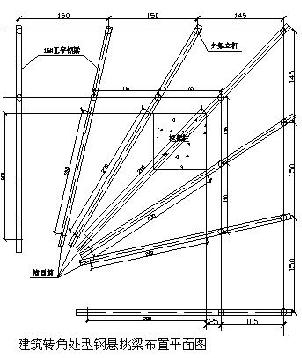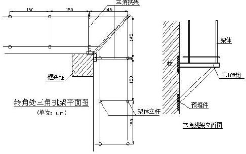 施工現(xiàn)場的型鋼懸挑外架在立面的轉(zhuǎn)角處的處理方法一般采用輻射式布置型鋼梁,這在小截面的角柱情況尚可行,但通常高層建筑的框架柱截面較大,采用輻射式布置型鋼梁,一般會遇到1-3根的型鋼懸挑梁布置在框架柱內(nèi),這使行柱筋偏位,柱內(nèi)的型鋼梁處的砼不密實(shí),影響框架柱的質(zhì)量,有可能造成重大安全隱患。且采用輻射方式布置型鋼梁的方法,使得外架轉(zhuǎn)角處的立桿間距布置不一,個別內(nèi)立桿未能落在型鋼梁上,成為虛腳現(xiàn)象。因在轉(zhuǎn)角處采用輻射梁布置,使得懸挑梁的長度較長,在無塔吊配合情況下,拆除型鋼梁相當(dāng)不便,或只能將型鋼梁割短后再拆除。因此建議在外架的轉(zhuǎn)角處的型鋼挑梁改用型鋼三角挑架。