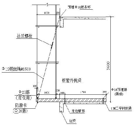 目前現(xiàn)場一般采用預(yù)埋筋的做法,根據(jù)計算采用預(yù)埋Φ16圓鋼即可滿足要求,懸挑梁應(yīng)設(shè)置兩道預(yù)埋筋,末端預(yù)埋筋為受力筋,距建筑外沿處的預(yù)埋筋為定位筋。懸挑梁的末端受力為受拉,因此受力筋應(yīng)采用未經(jīng)冷拉處理的Ⅰ級圓鋼。預(yù)埋筋采用兩段埋設(shè),以便安裝型鋼梁,型鋼挑梁安裝定位后,兩根預(yù)埋筋進(jìn)行單面搭接焊,焊長為10d。