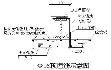 對預(yù)埋筋的受力驗(yàn)算一般都能滿足要求,但對于樓板厚度較小的應(yīng)驗(yàn)算預(yù)埋筋與結(jié)構(gòu)樓板之間的承載力驗(yàn)算。在預(yù)埋筋外的樓板應(yīng)加強(qiáng)梏配筋措施,宜增配2Φ12筋,長度2m。當(dāng)預(yù)埋錨筋處的樓板面無負(fù)筋時,應(yīng)增設(shè)Φ6@200×200鋼筋網(wǎng)片2m見方,且應(yīng)與周邊的樓板負(fù)筋連接在一起。如下圖所示。