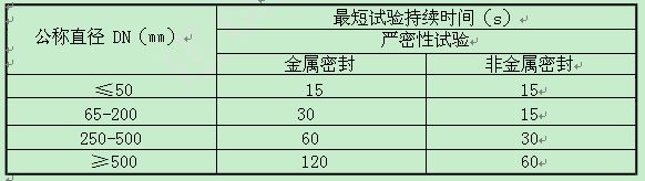 強(qiáng)度試驗(yàn)時(shí),試驗(yàn)壓力為公稱(chēng)壓力的1.5倍。持續(xù)時(shí)間不少于5min,閥門(mén)的殼體、填料應(yīng)無(wú)滲漏。嚴(yán)密性試驗(yàn)時(shí),試驗(yàn)壓力為公稱(chēng)壓力的1.1倍;試驗(yàn)壓力在試驗(yàn)持續(xù)的時(shí)間內(nèi)保持不變,時(shí)間應(yīng)符合下表的規(guī)定,以閥辯密封面無(wú)滲漏為合格。
